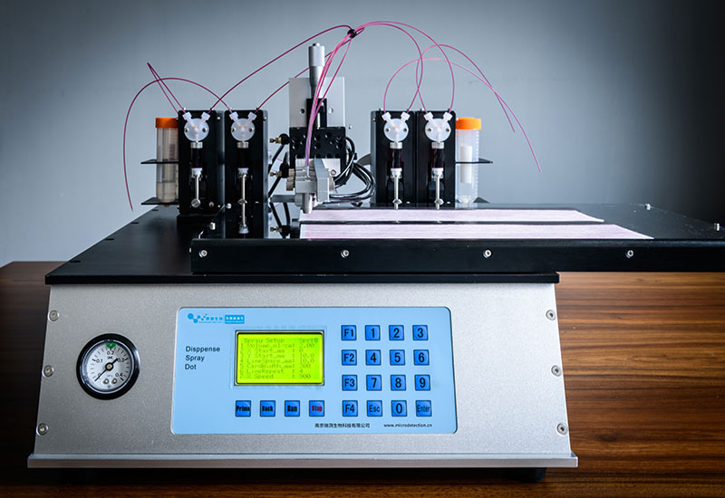 大平臺(tái)多通道噴金標(biāo)機(jī)應(yīng)用于生產(chǎn)過程中均勻地把膠體金,熒光微球,量子點(diǎn)等顆粒均勻地噴在聚酯膜,玻纖等材料上。相比于傳統(tǒng)的噴金機(jī),效率大大提高,是特大型企業(yè)必備的生產(chǎn)設(shè)備之一。